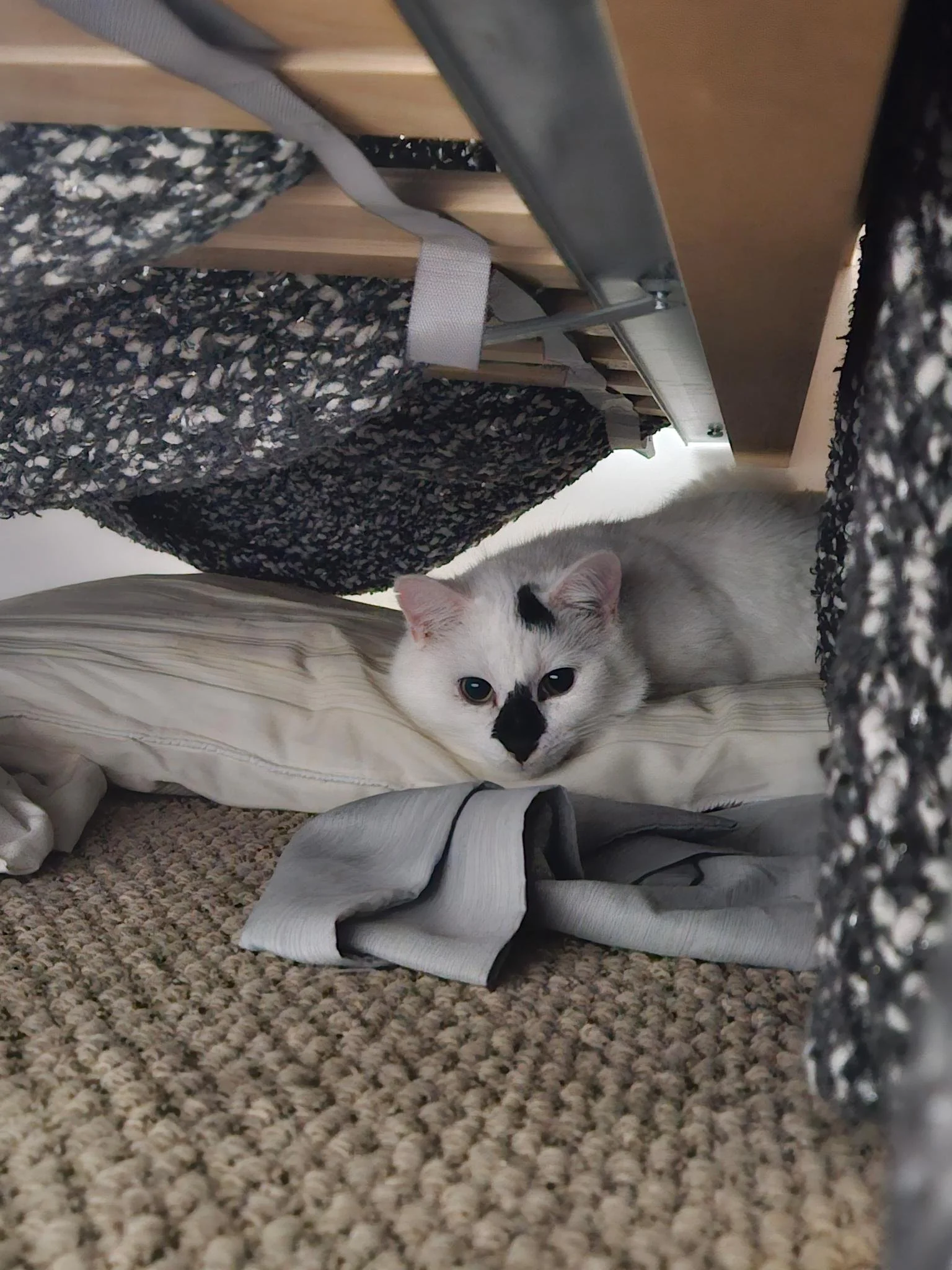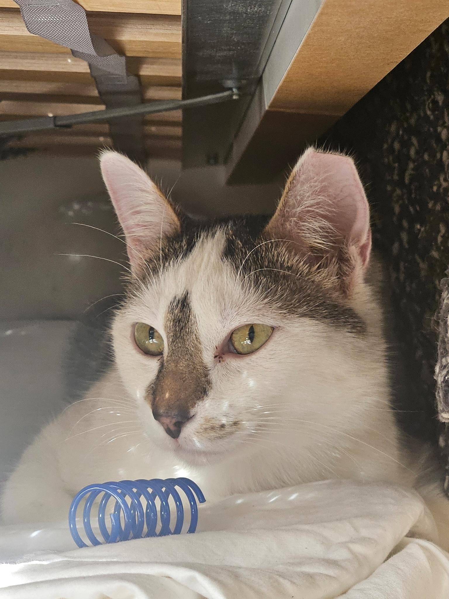 He is most at home when he has a quiet, cozy spot to feel safe. At night, he will come out to explore and play with toys. Right now, he prefers to be admired from a distance. From his diamond nose to his white-tipped tail, he is a handsome gentleman. He is a gentle soul looking for a new home full of tuna treats and comfy hiding spots.