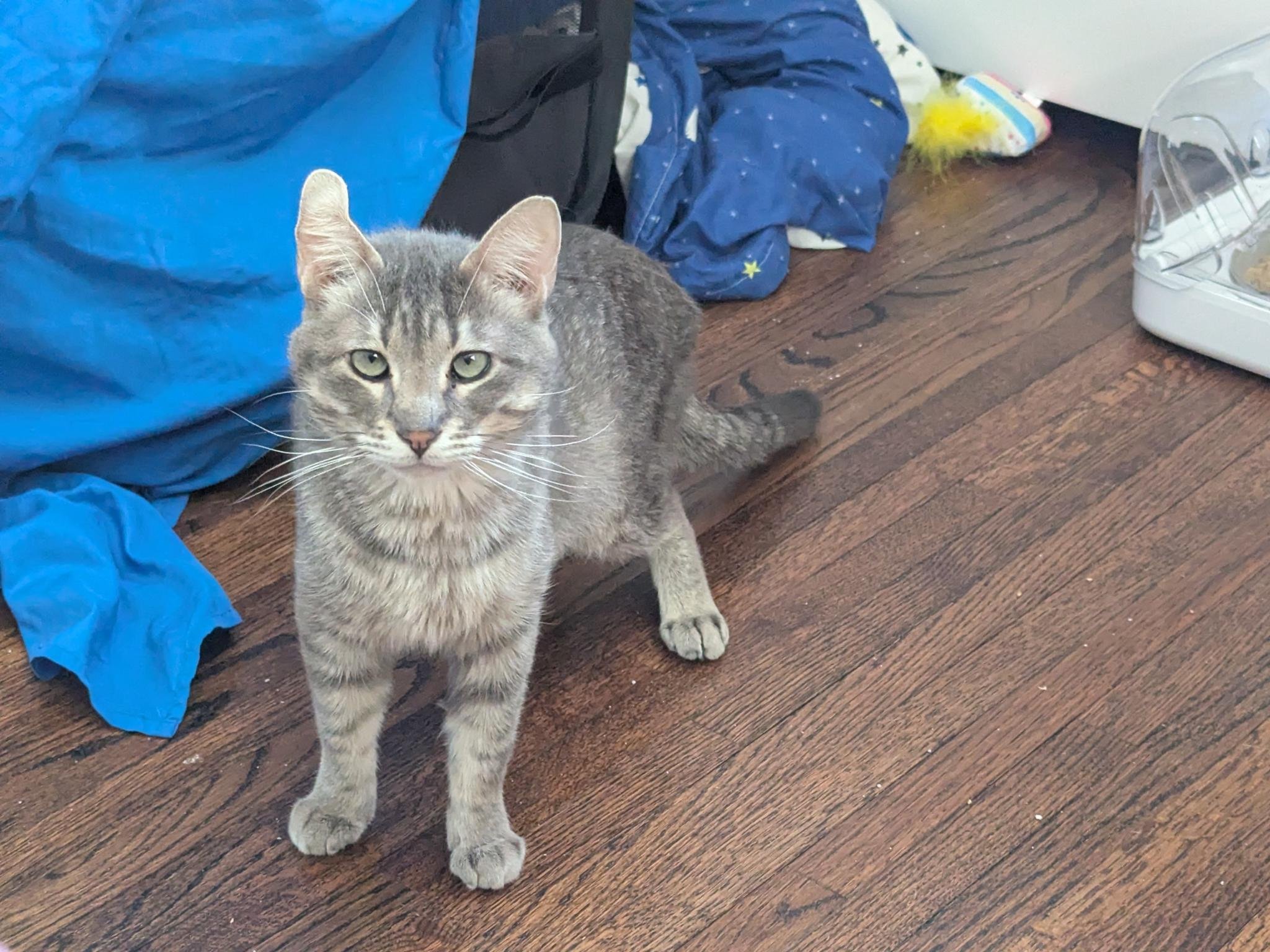 Woodrow is a pretty friendly guy who would love a home where he can get a lot of affection on his own terms. He’s a handsome, curious fellow and started life surrounded by other cats, but has also done well being fostered as an only cat. He may take a little while to warm up because he missed out on socialization during a critical development period, but his foster dad has seen him gain confidence in the weeks he’s had him, and Woodrow is a resilient guy. We need him to go to a home that will be understanding about Woodrow’s need to move at his own pace and celebrate his socialization milestones with him. Because he didn’t get a lot of exposure to novelty as a young kitten, we need a quiet home without young kids, loud dogs, or other unpredictable sounds (like cheering at football on TV, etc.).