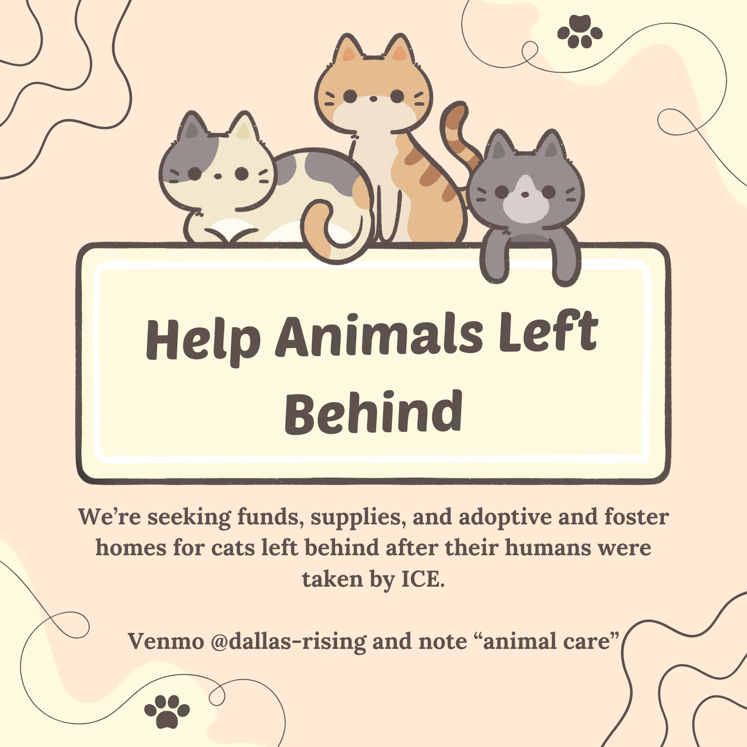 Venmo @dallas-rising (9707) and note “Animal Care”.